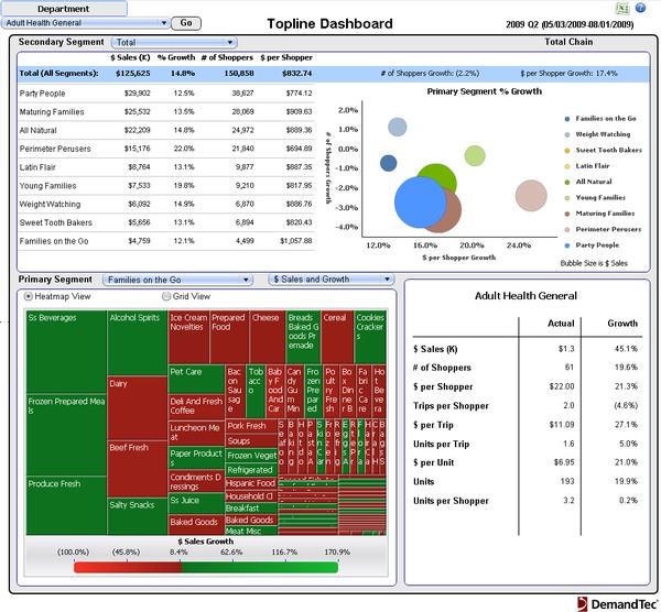 Shopper Insights provides 21 dashboards, each containing vital information about your shoppers at various levels of analysis, from the enterprise-level Topline Dashboard to the individual item level, using granular drill-down dashboards like the Item Importance Dashboard. Using these interactive dashboards, you can research performance across: